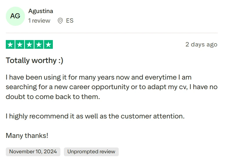 i) The user mentioned that they’ve been using Novoresume for years and always return to it when updating their CV, praising its reliability and excellent customer support.